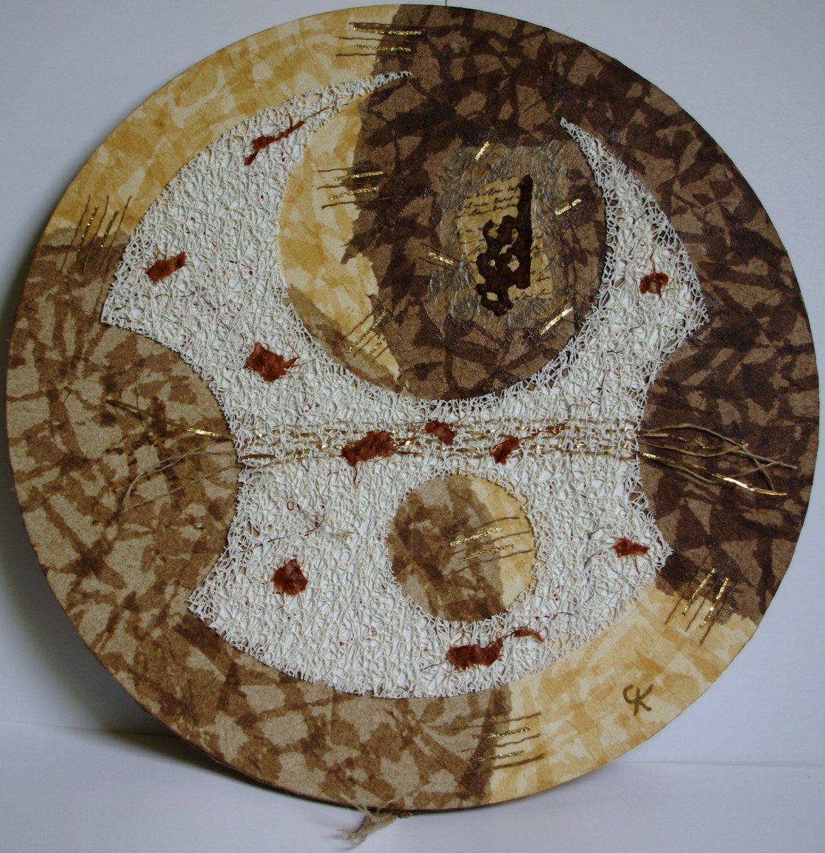 Oeuvre en collage de papiers et diverses matières sur chassis de diamètre 50 cm.