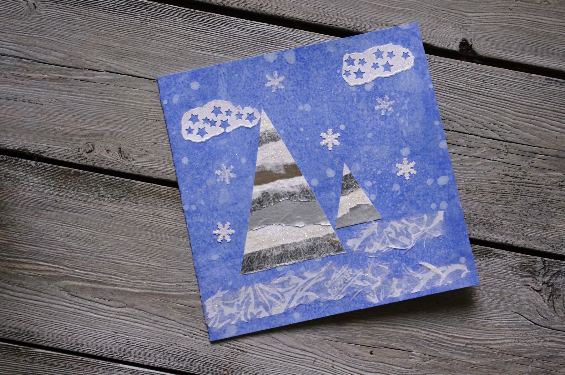 Carte double carrée "Sapins enneigés sous nuages étoilés" fond bleu