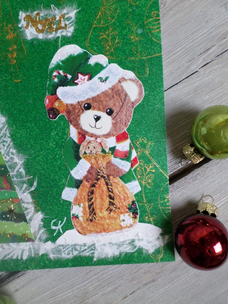 Reproduction repeinte d’Amandine lutine (création personnelle), paillettes, et tampons.