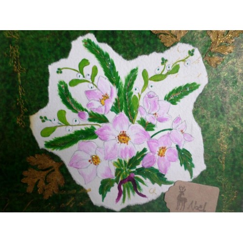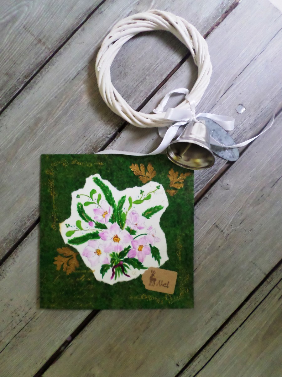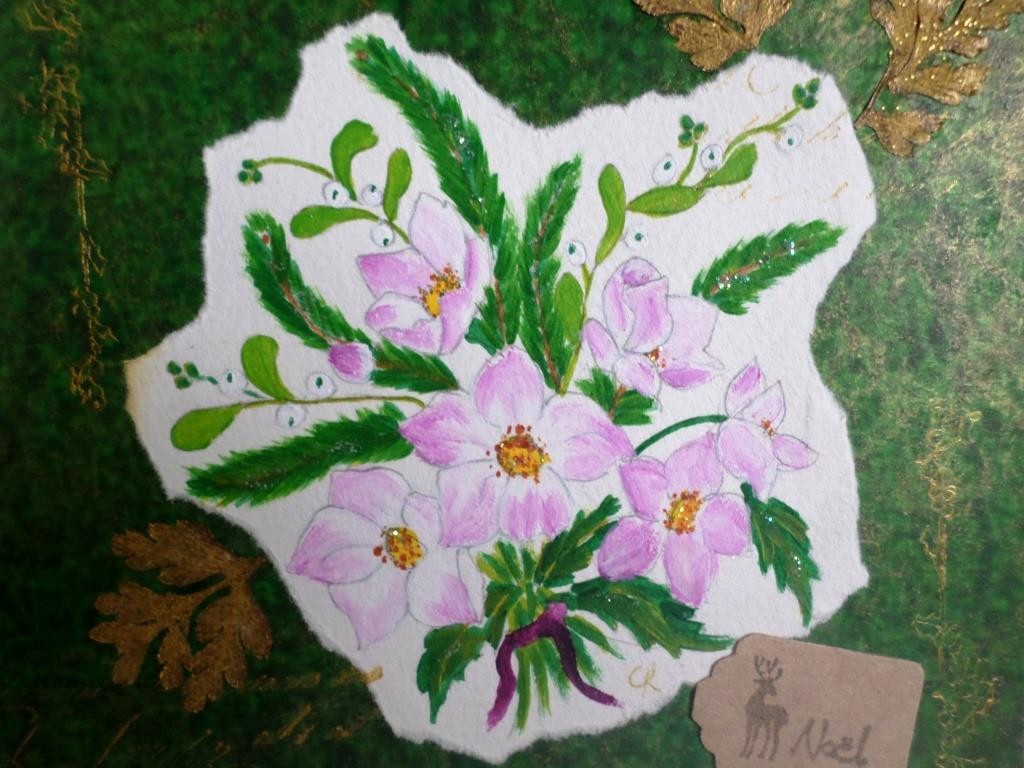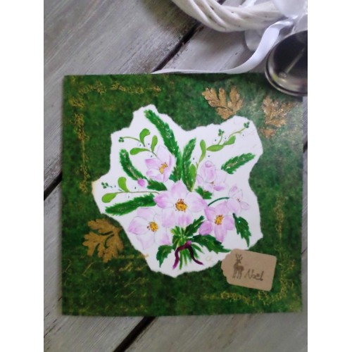 Fleurs peintes à l'acrylique, vraies feuilles dorées et tampons.