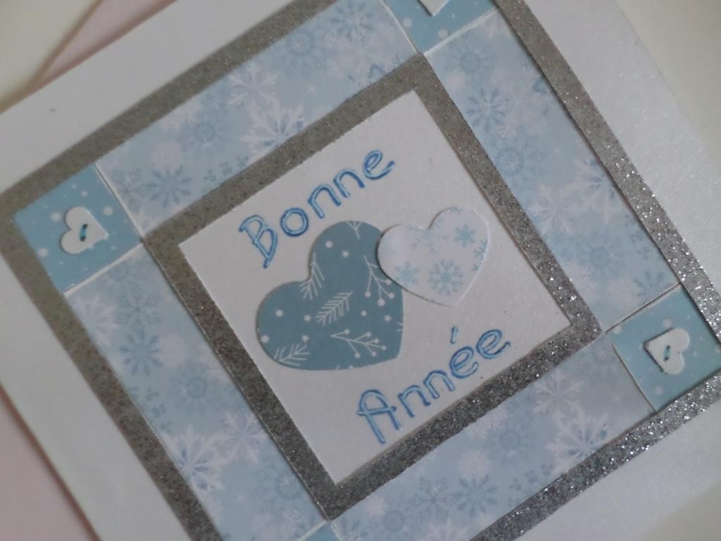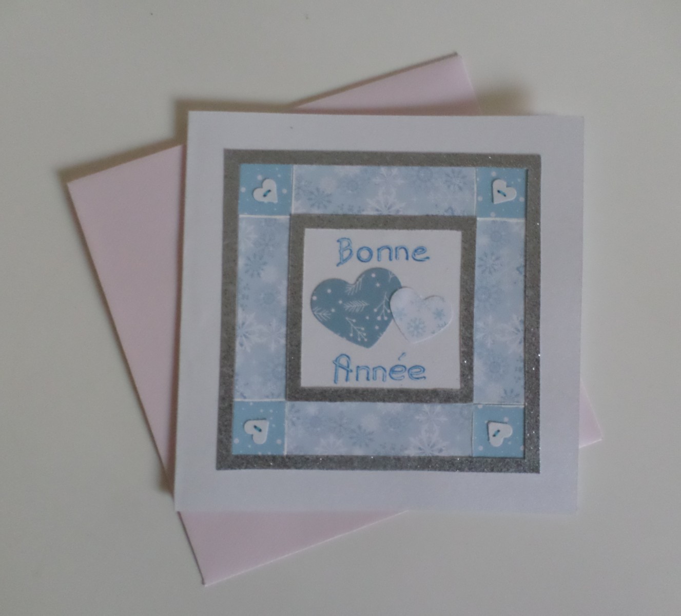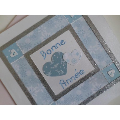 Sur papier blanc nacré, un décor façon patchwork bleu pastel.
