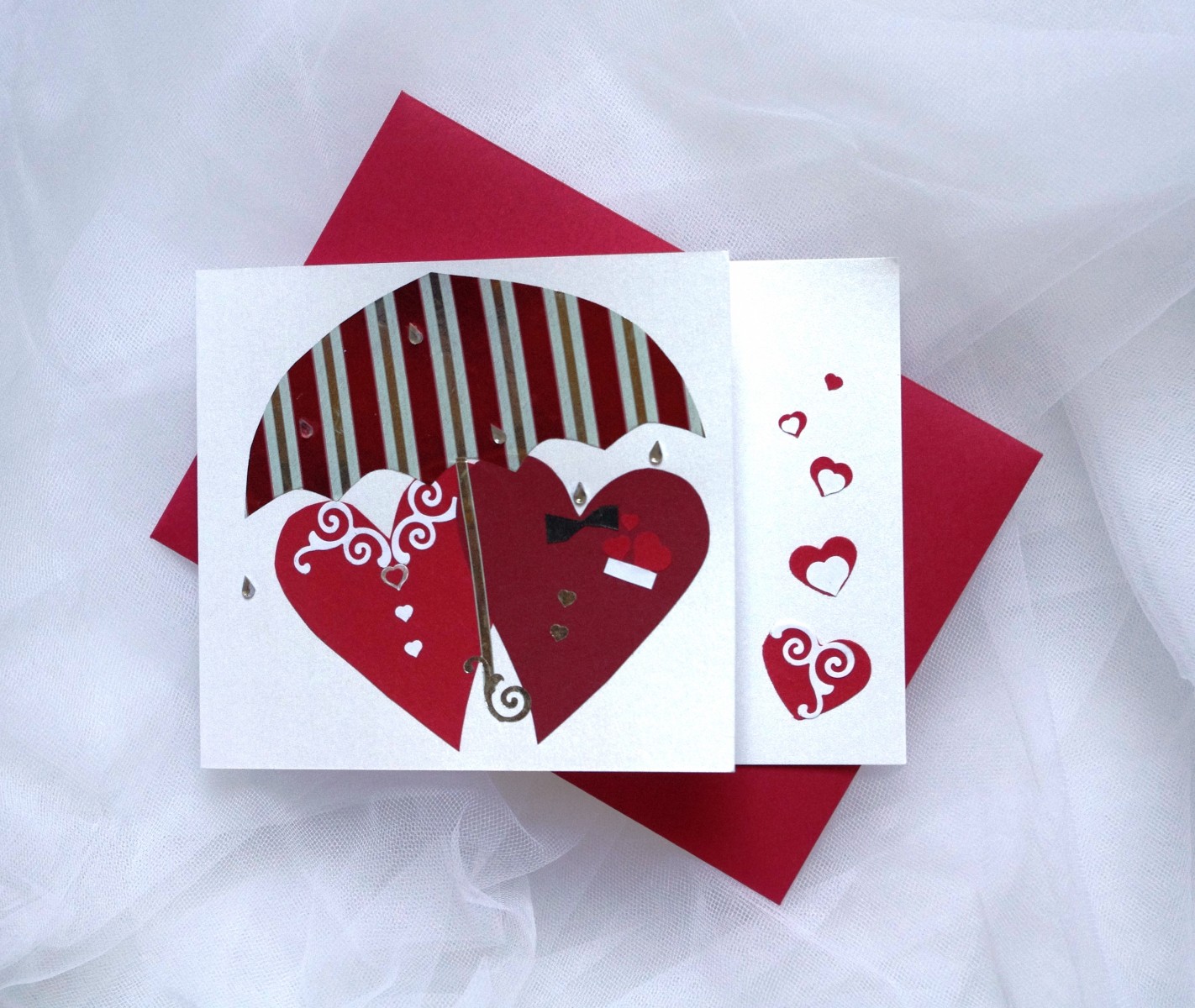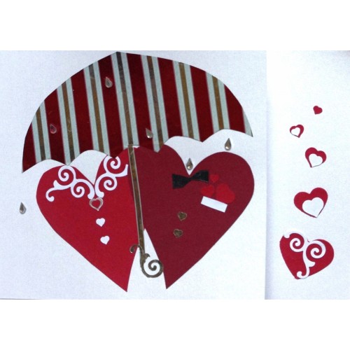 Carte horizontale asymétrique en papier nacré de qualité (300g) décorée avec des cœurs en papier rouges, papier rayé rouge, blanc, argent. Strass argenté.