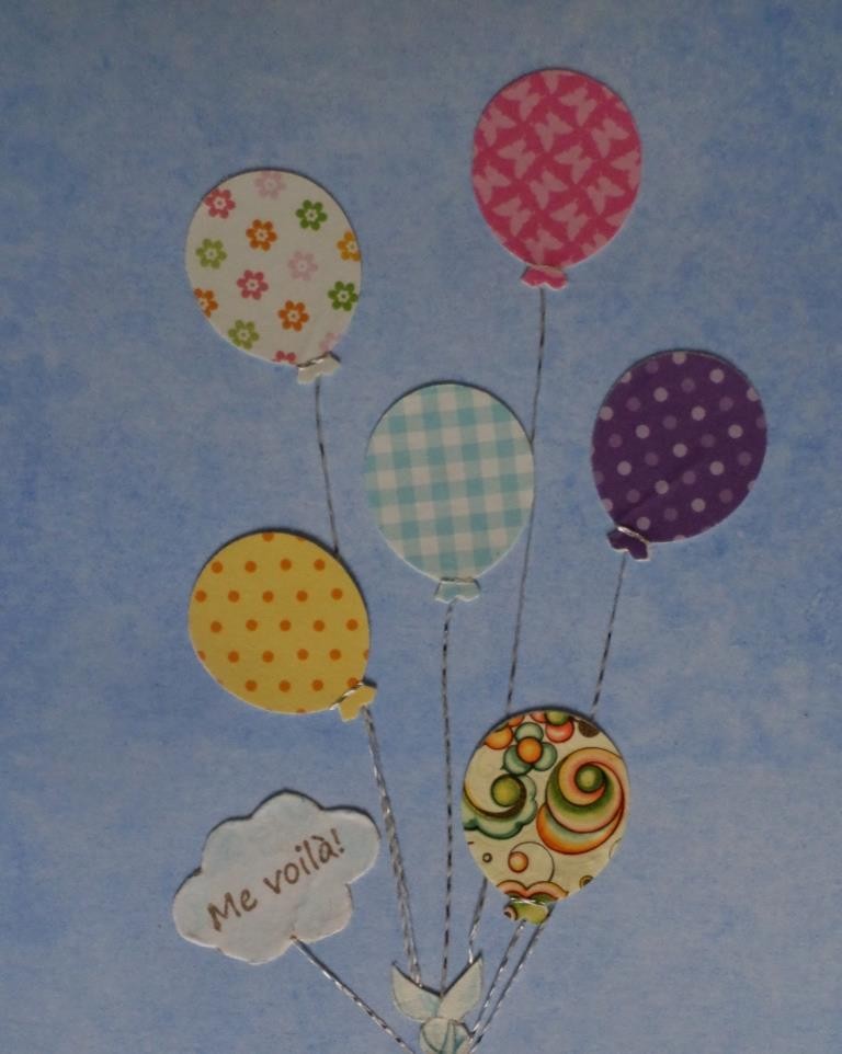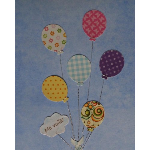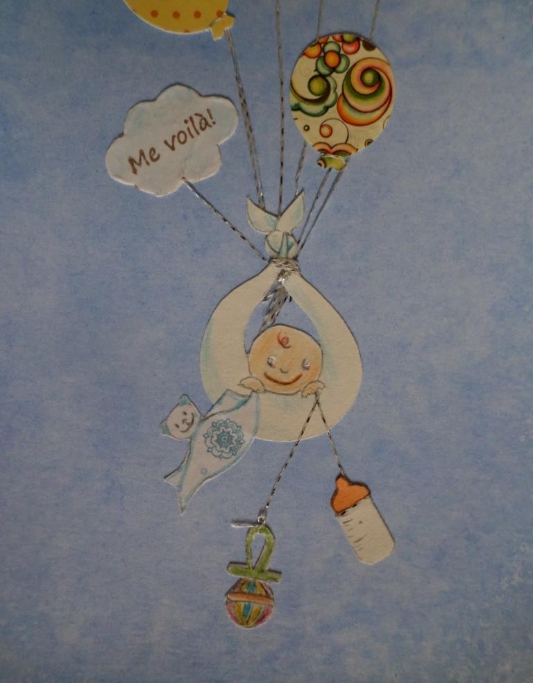 Un bébé dans ses langes arrive par les airs, porté par 6 ballons colorés et un "petit nuage message."