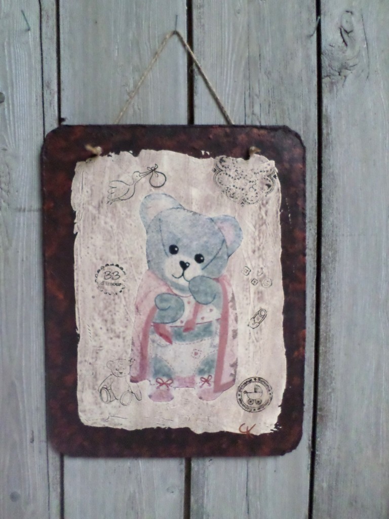 Décoration murale imitation plaque de métal rouillé avec transfert d'une reproduction d'une de mes oeuvres.