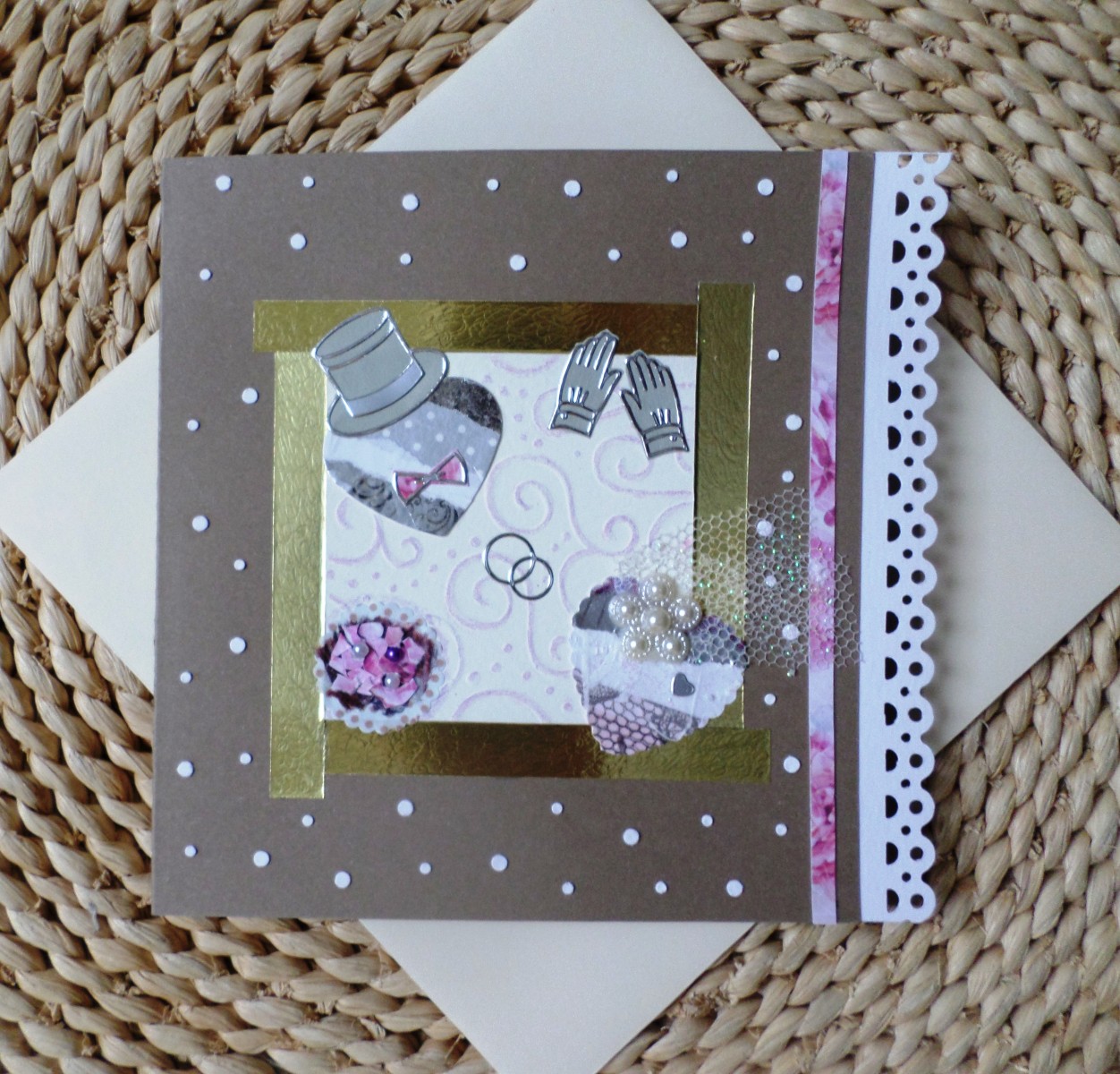Papier 300 g/m², couleur taupe, bordure dentelle.