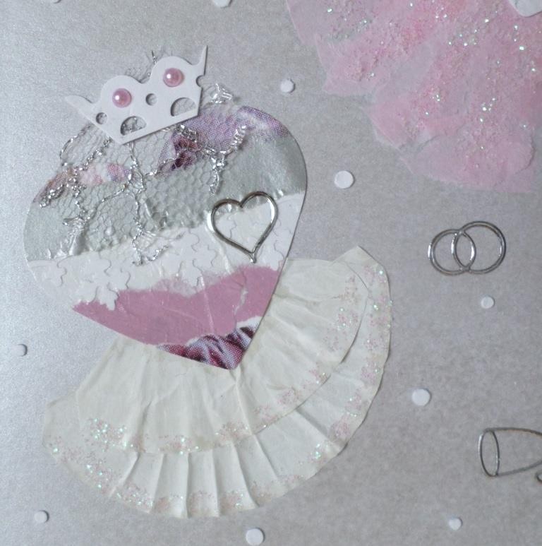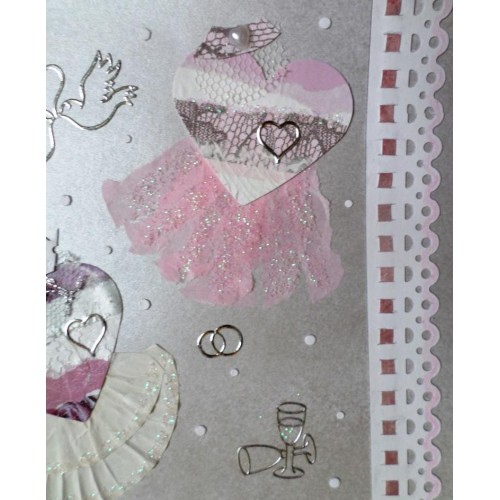 Une jolie dentelle enrubannée donne de la poésie à ces deux coeurs en tenue de mariés.