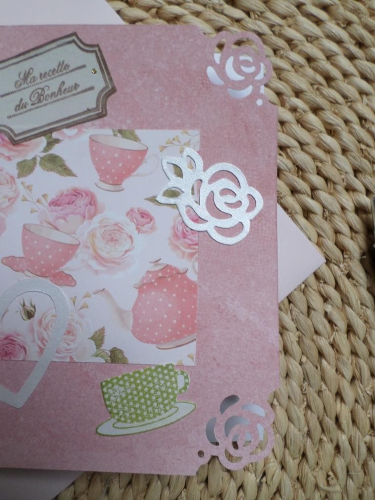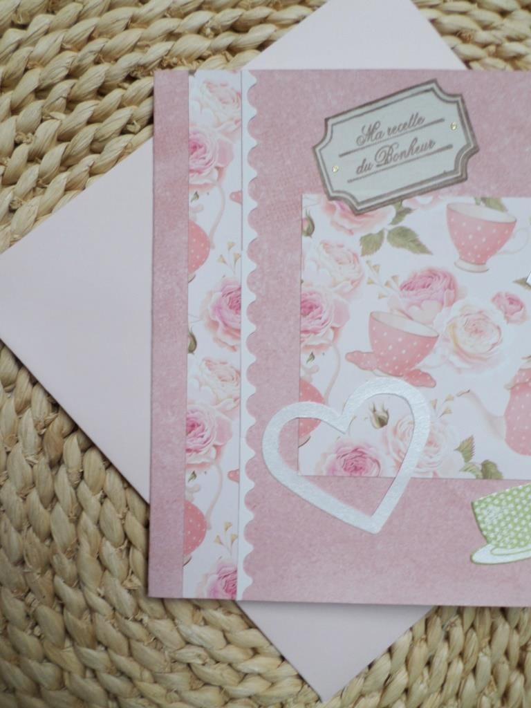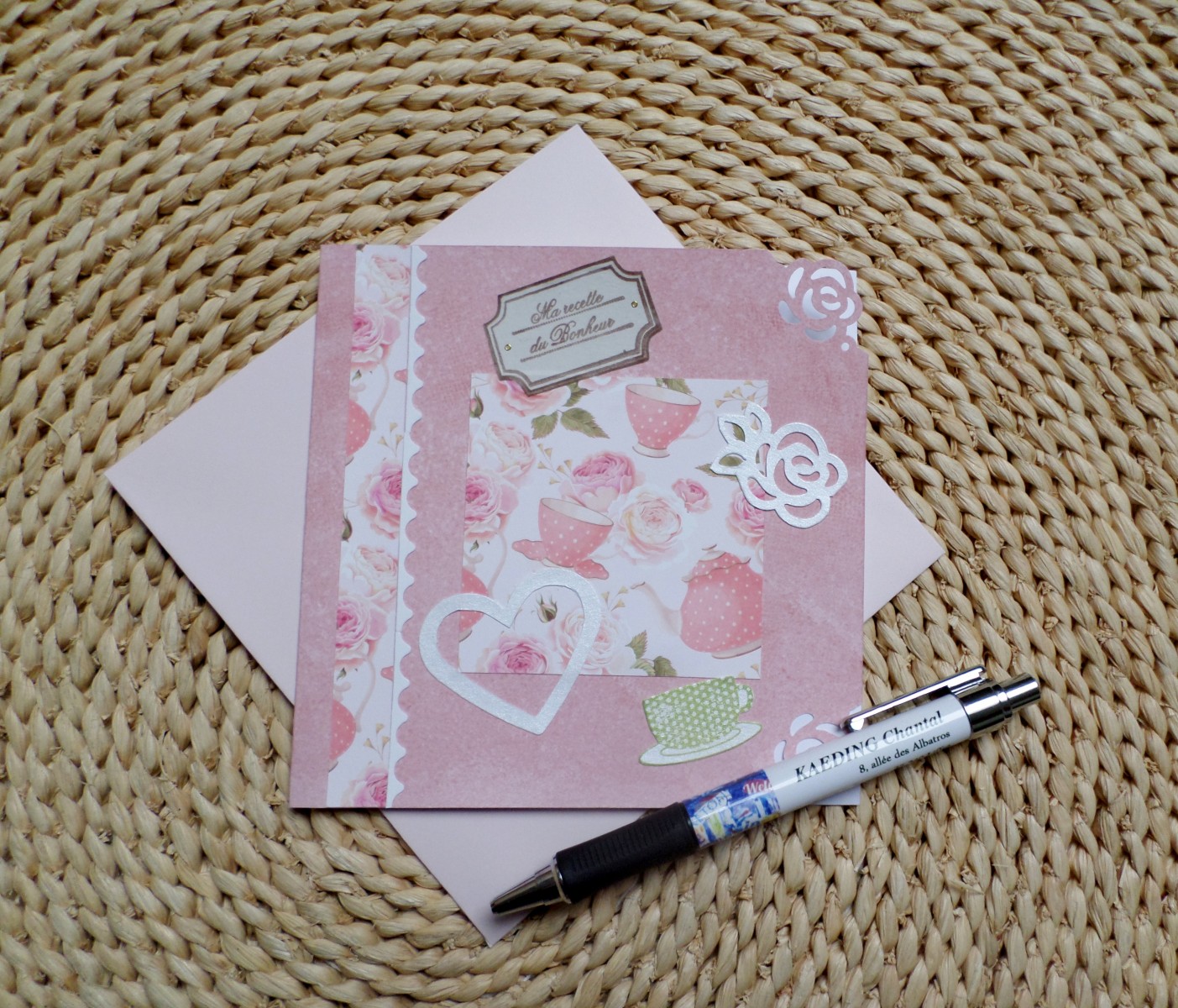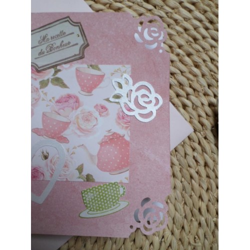 Des roses, une dentelle ainsi qu'une petite tasse nous ramène à la recette du bonheur: prendre le temps de vivre, un moment à apprécier seul(e) ou à partager en famille, avec des amis...