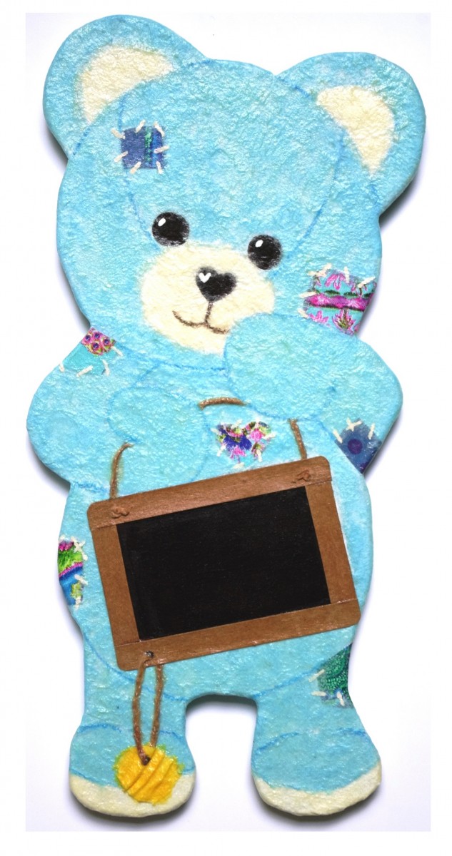 Vous aurez le choix entre différents coloris de poil (les pièces de rapiéçage seront assortis selon la couleur choisie) et bien entendu l'inscription désirée que vous m'aurez communiqué sera peinte sur l'ardoise.