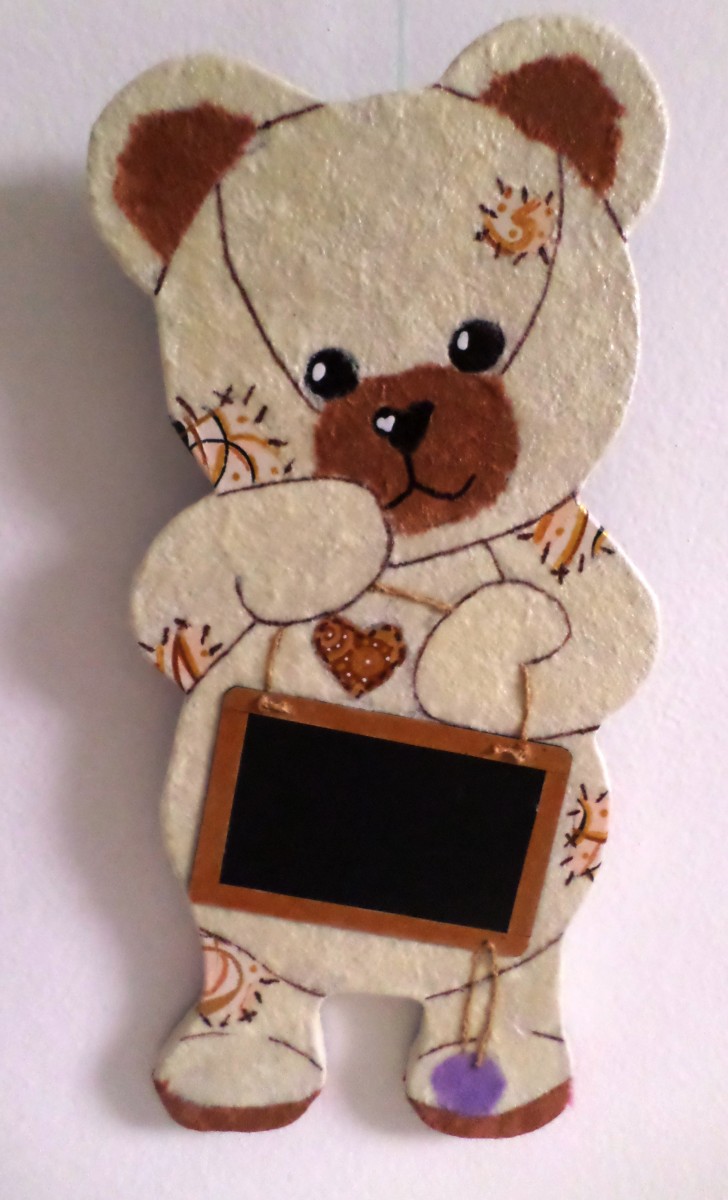 Vous aurez le choix entre différents coloris de poil (les pièces de rapiéçage seront assortis selon la couleur choisie) et bien entendu l'inscription désirée que vous m'aurez communiqué sera peinte sur l'ardoise.