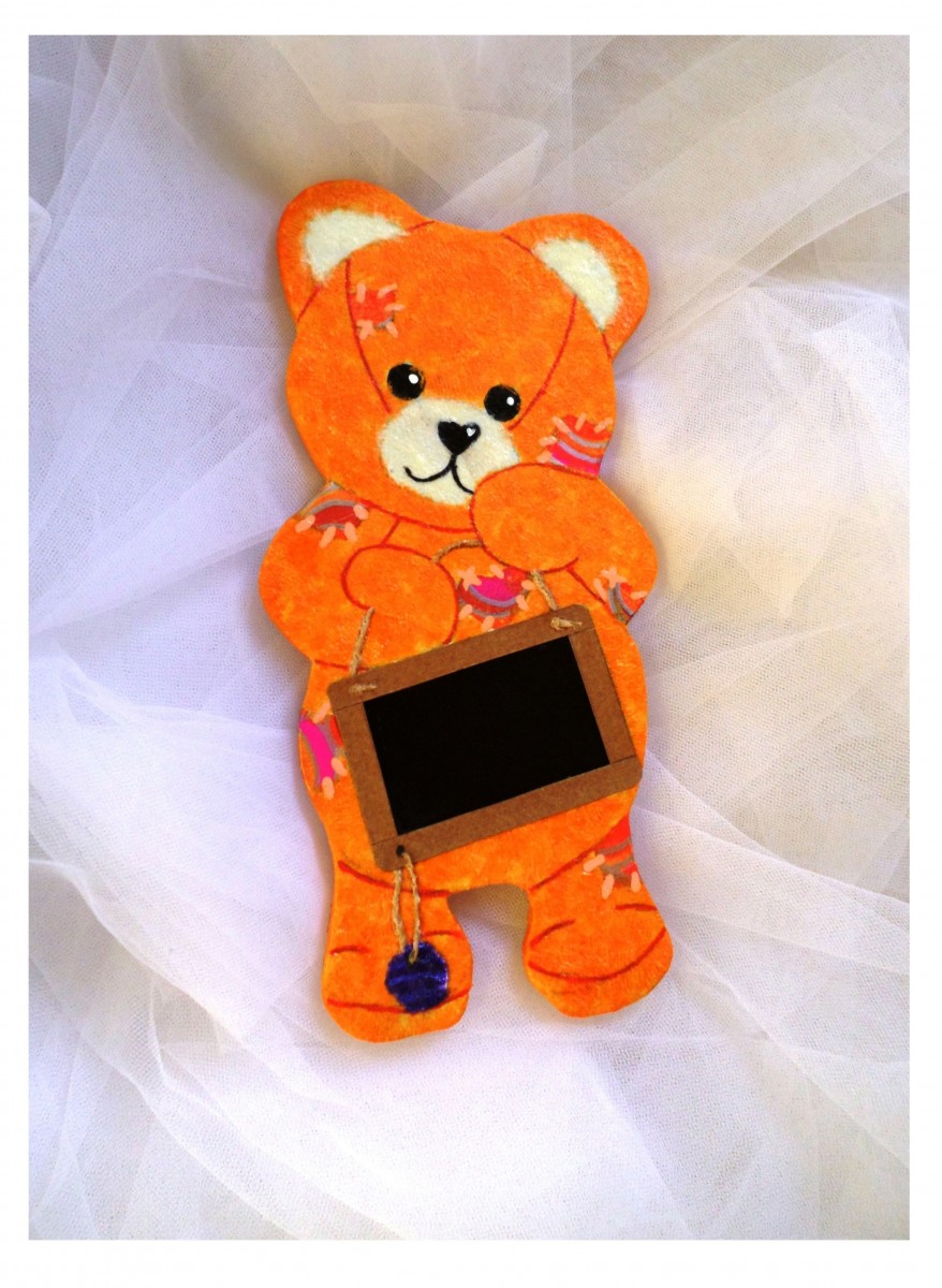 Vous aurez le choix entre différents coloris de poil (les pièces de rapiéçage seront assortis selon la couleur choisie) et bien entendu l'inscription désirée que vous m'aurez communiqué sera peinte sur l'ardoise.
