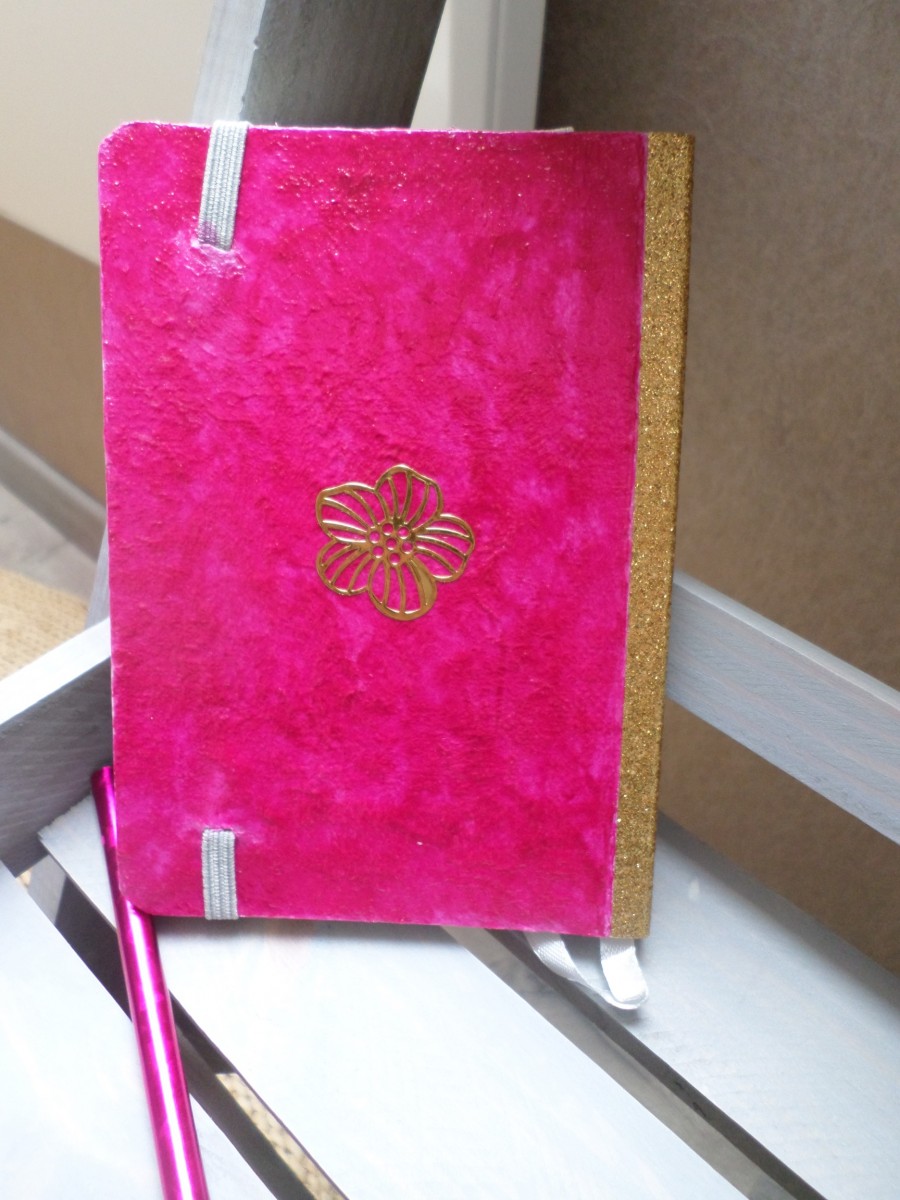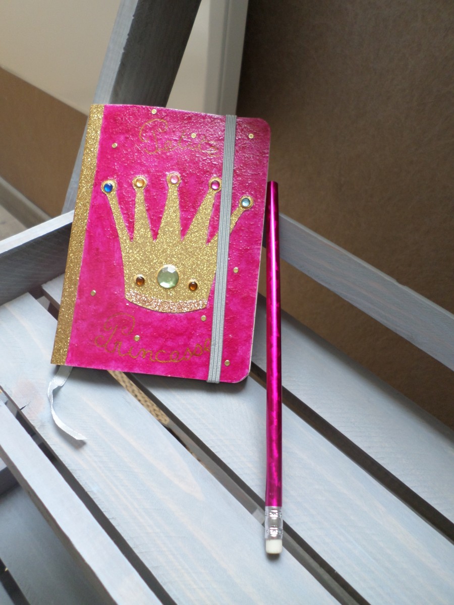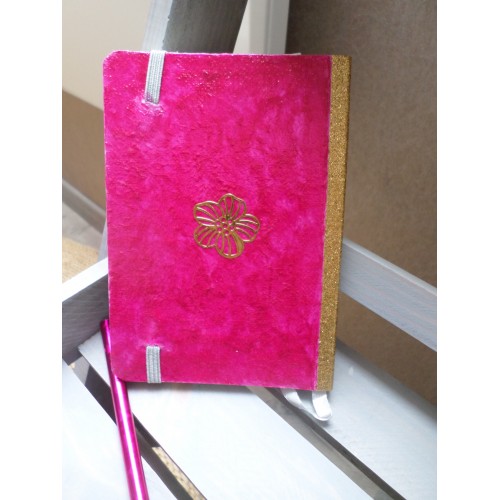 Une belle couronne d’or pailleté, ornée de pierres de diverses couleurs, décore ce carnet rose indien.