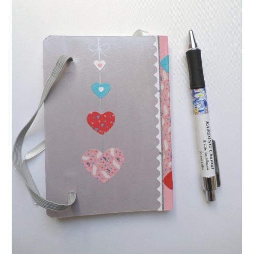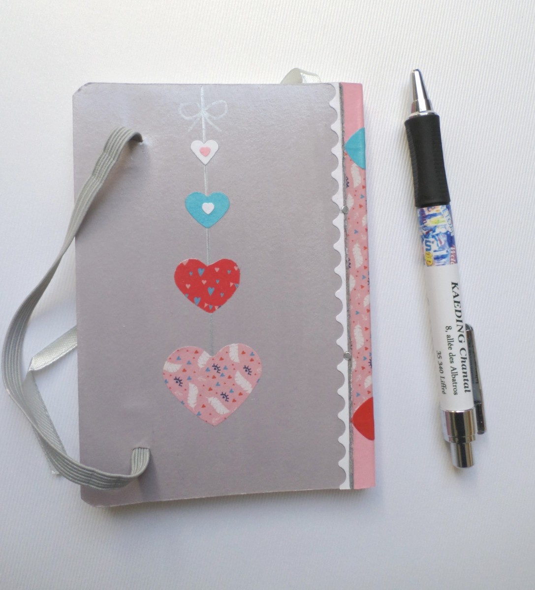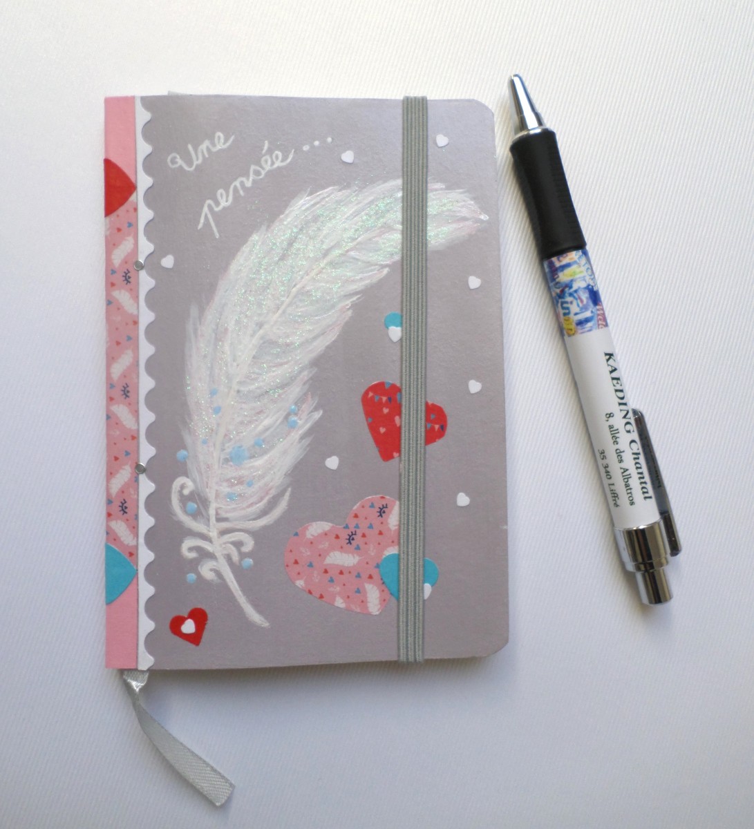 Peint en gris taupe, ce carnet est orné d’une plume peinte à la main, de cœurs de diverses tailles et coloris ainsi que d’une petite dentelle de papier blanc.