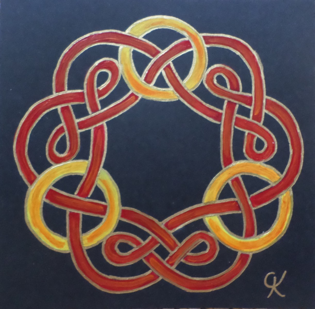 02-Carte carrée "Celte" entrelacs rouges, nœuds jaunes.
