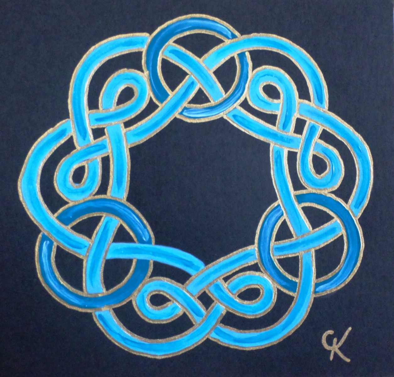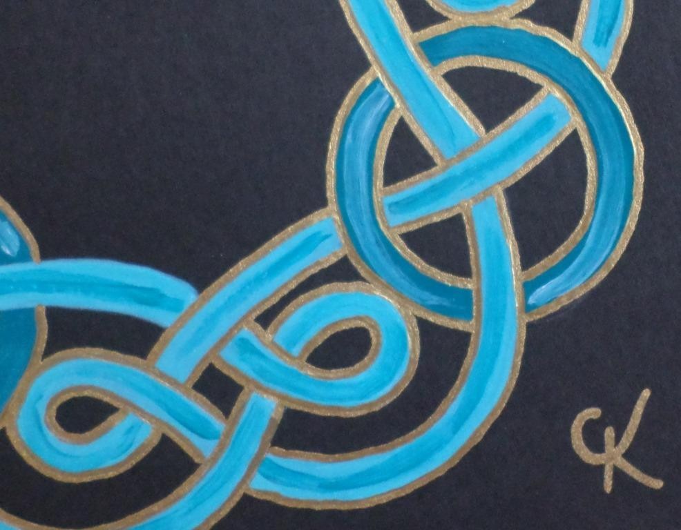 09-Carte carrée "Celte" turquoise : entrelacs clairs, nœuds foncés.