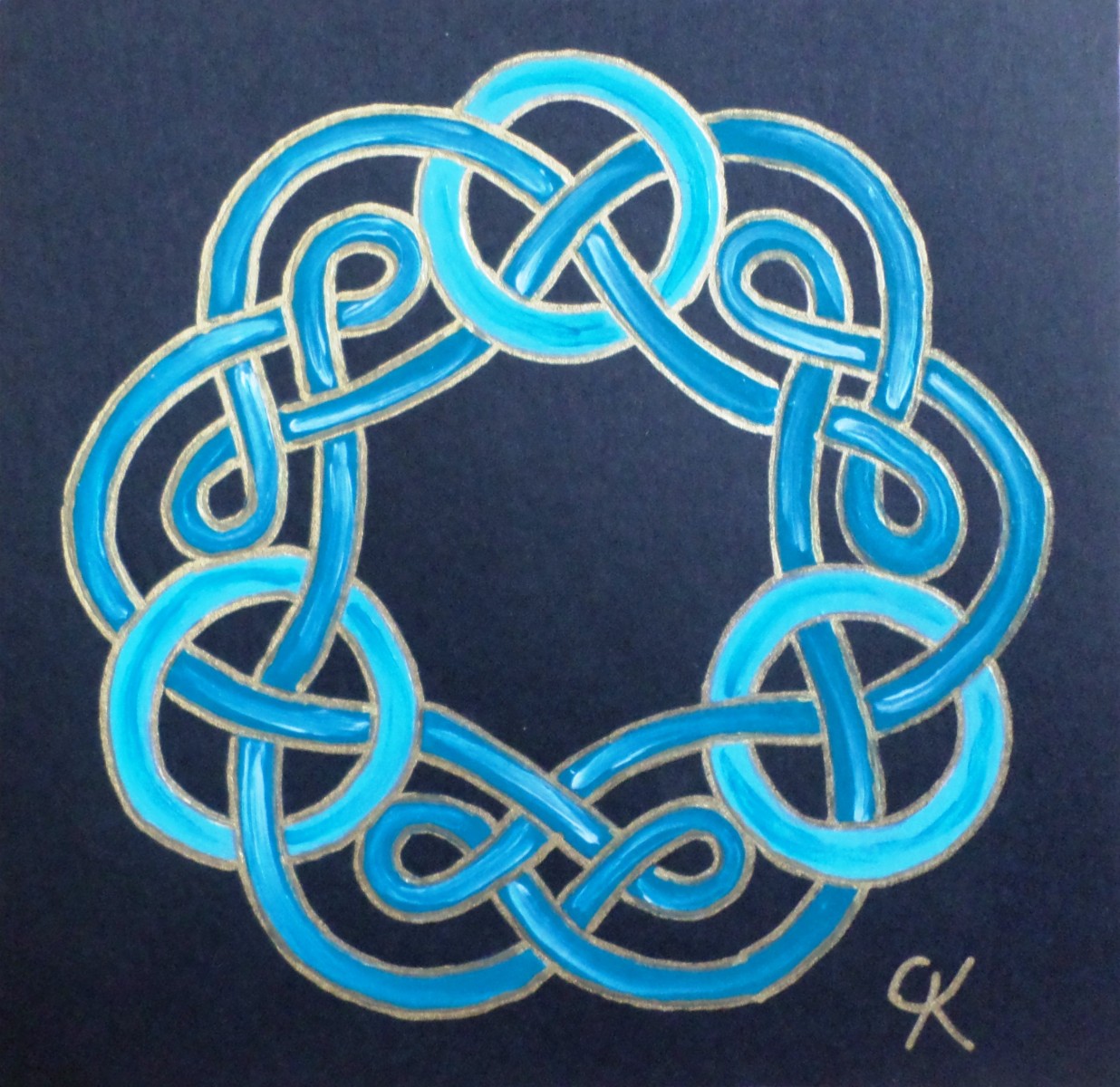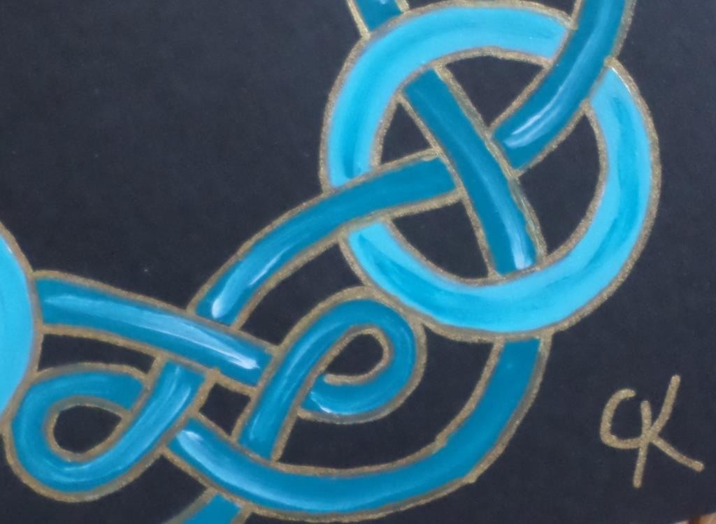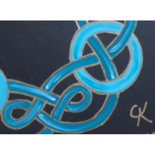 10-Carte carrée "Celte" turquoise : entrelacs foncés, nœuds clairs.