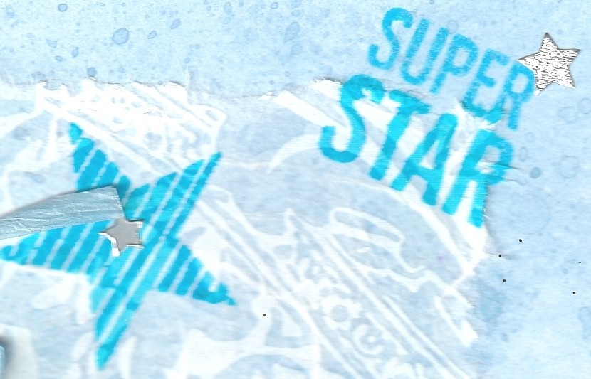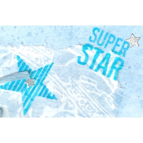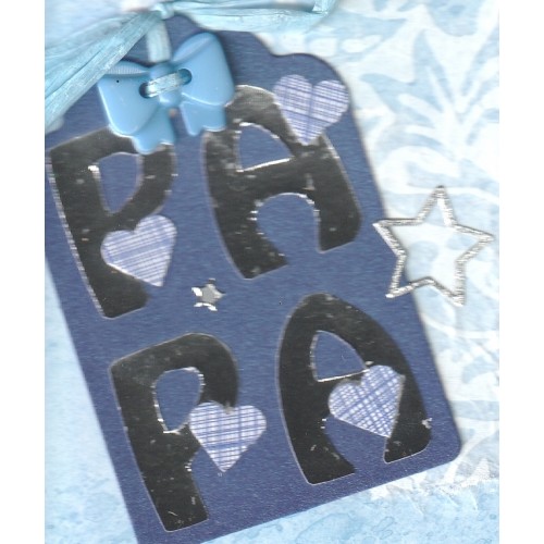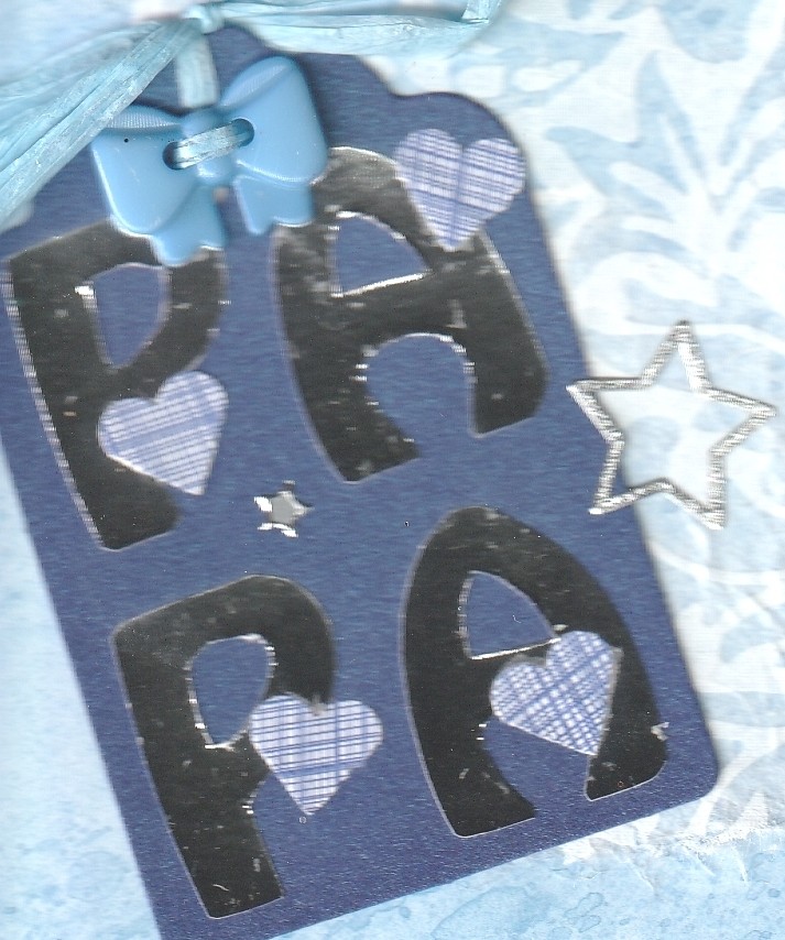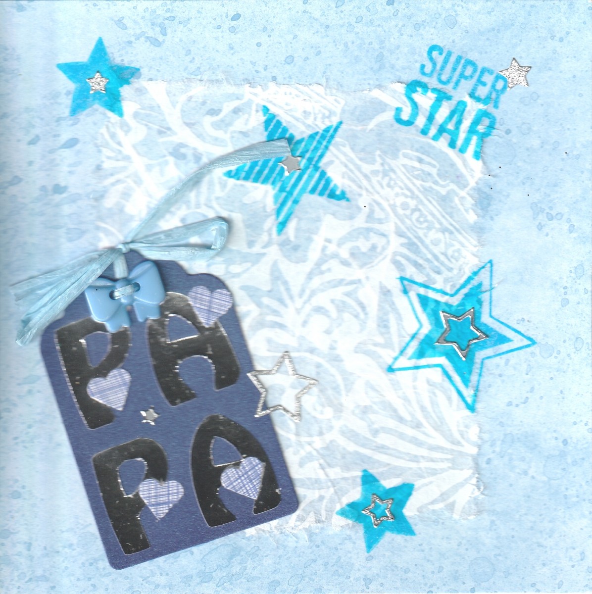 Sur une étiquette bleu paillettée le mot "PAPA", un noeud bouton et un flot rafia, des étoiles bleues au tampon sur lesquelles sont posés des étoiles argents.