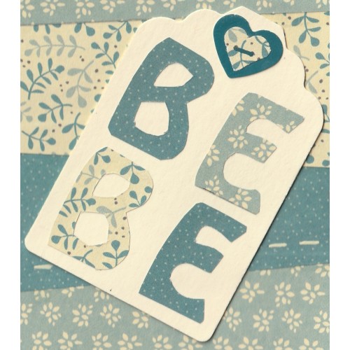 Des bandes asymétriques de différents bleus turquoise et motifs servent de fond à une étiquette blanche où est inscrit le mot "BEBE".