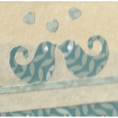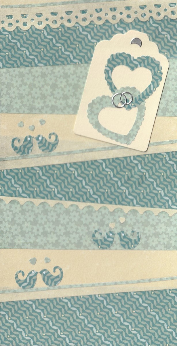 Des bandes asymétriques de différents bleus turquoise et motifs servent de fond à une étiquette blanche où es'entrelacent deux coeurs ajourés.