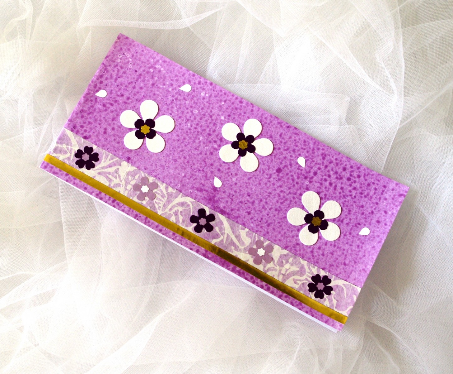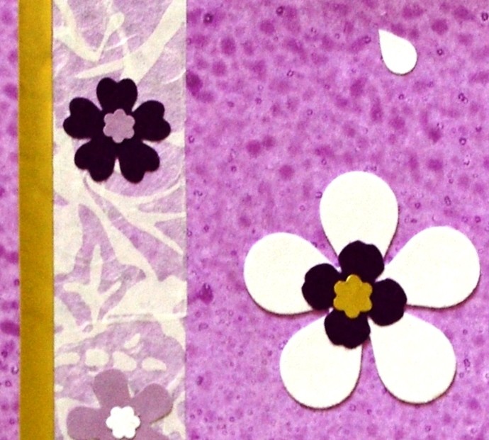 Trois petites violettes sur dentelle bordée d'une bande or et trois autres sur des pétales blancs pour passer votre message...