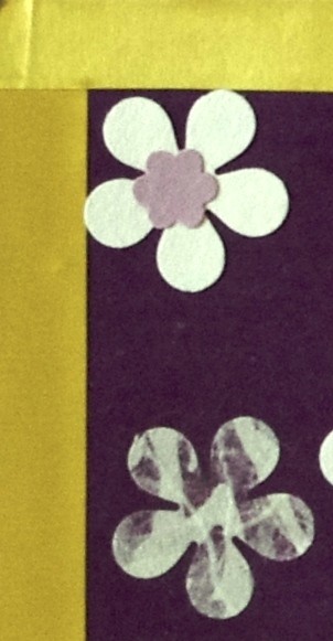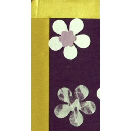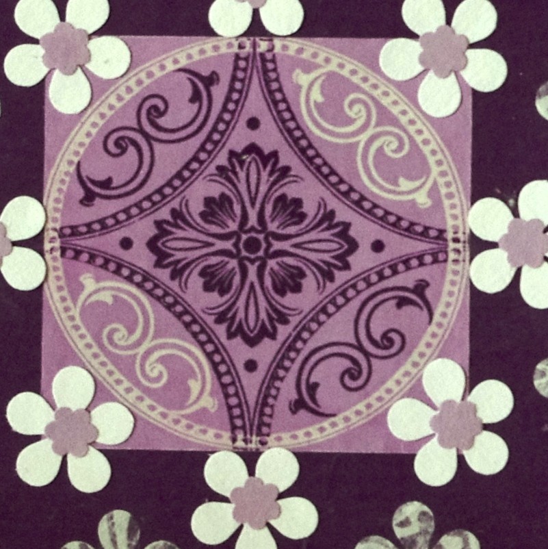 Un joli papier fond violet aux motifs de paquerettes stylisée encadrant un motif baroque.