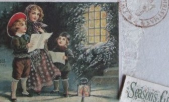 La carte est agrémentée d’un dessin époque 1900, de tampons et autres papiers.