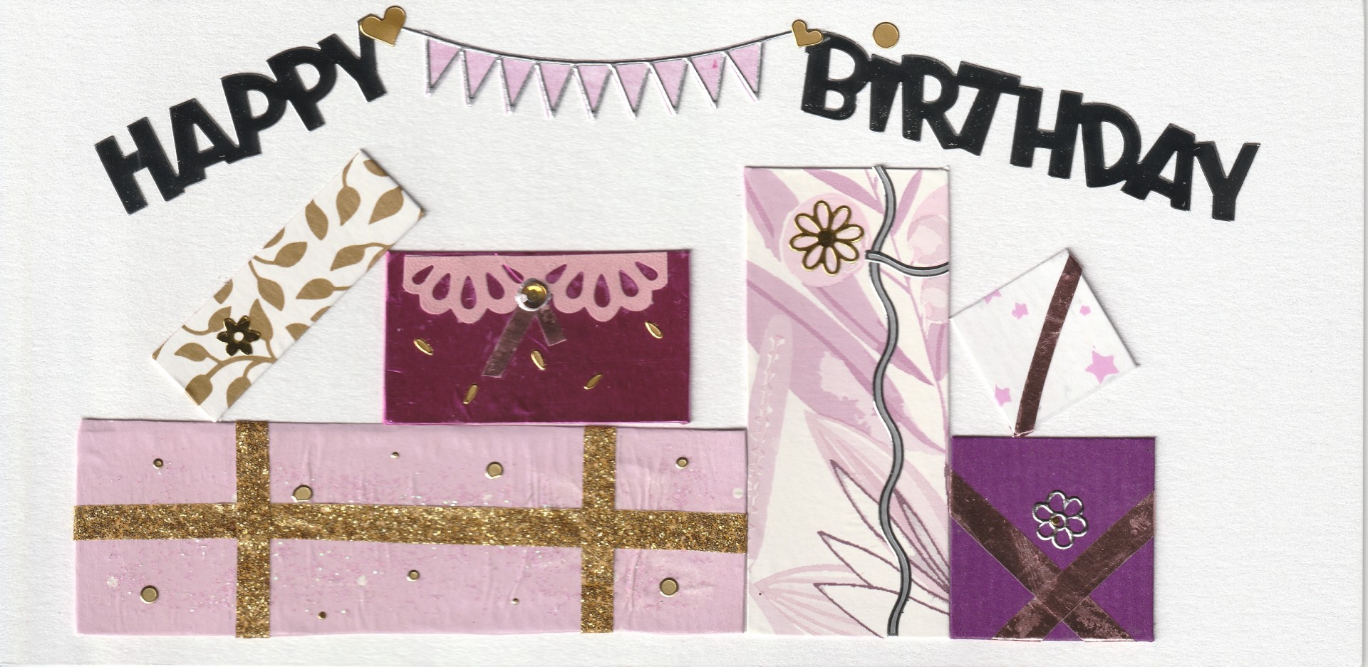 Un ensemble de paquets de divers cadeaux, surplombé des mots "HAPPY BIRTHDAY" qui encadrent une petite banderole rose claire.