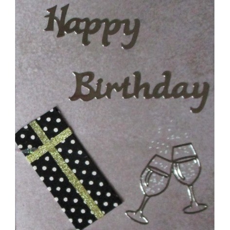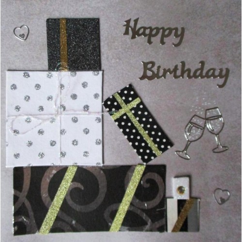 "HAPPY BIRTHDAY" en lettres argentées annonce une pile de cadeaux...collées.