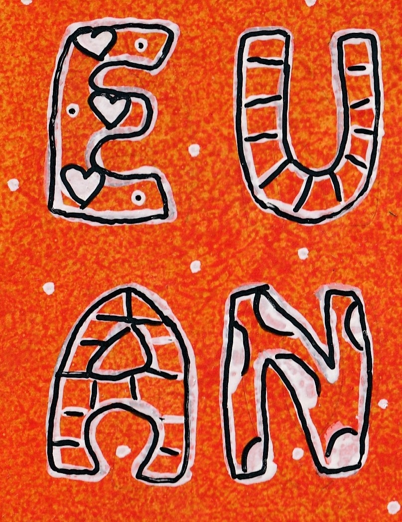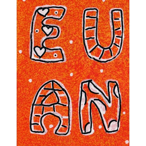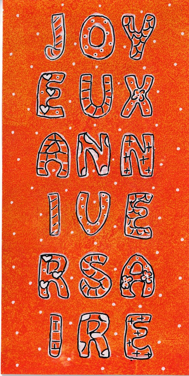 "JOYEUX ANNIVERSAIRE" y est inscrit en lettres stylisée coeurs, briques, fleurs...