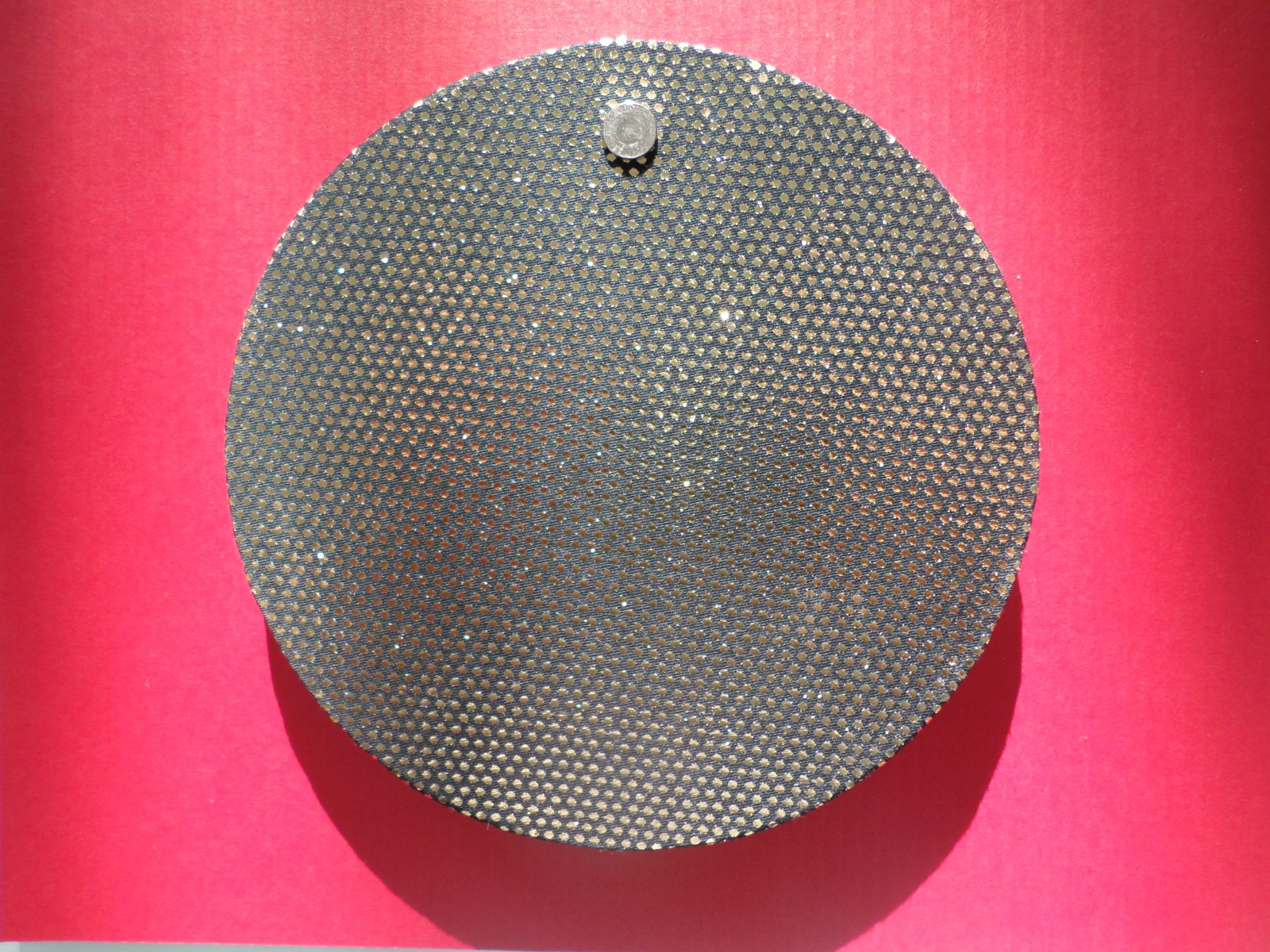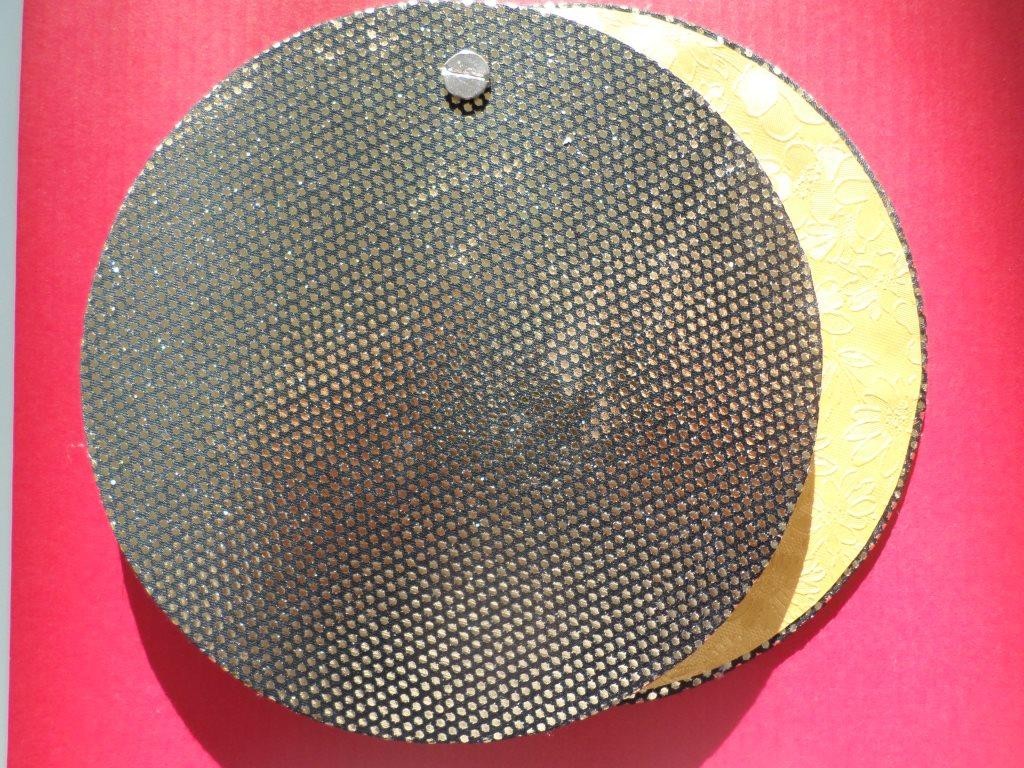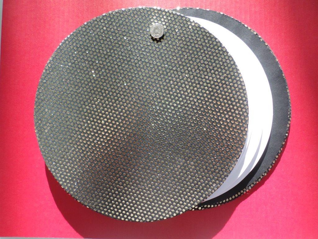 Ce joli carnet rond de 40 pages blanches, couverture cartonnée recouverte d'un tissu dominante noir et or, le tout réalisé par mes soins.