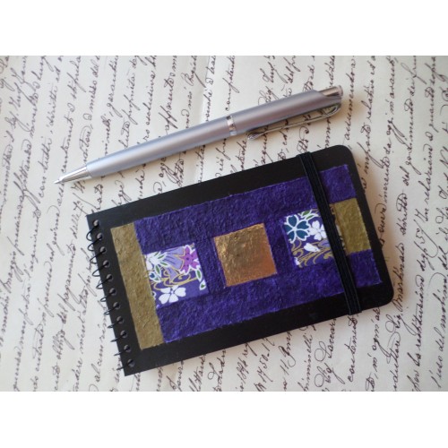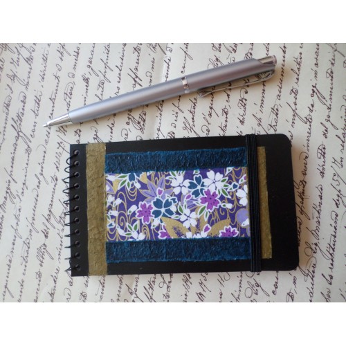 22 - Carnet de sac ou de poche, noir, or et violet petits motifs floraux